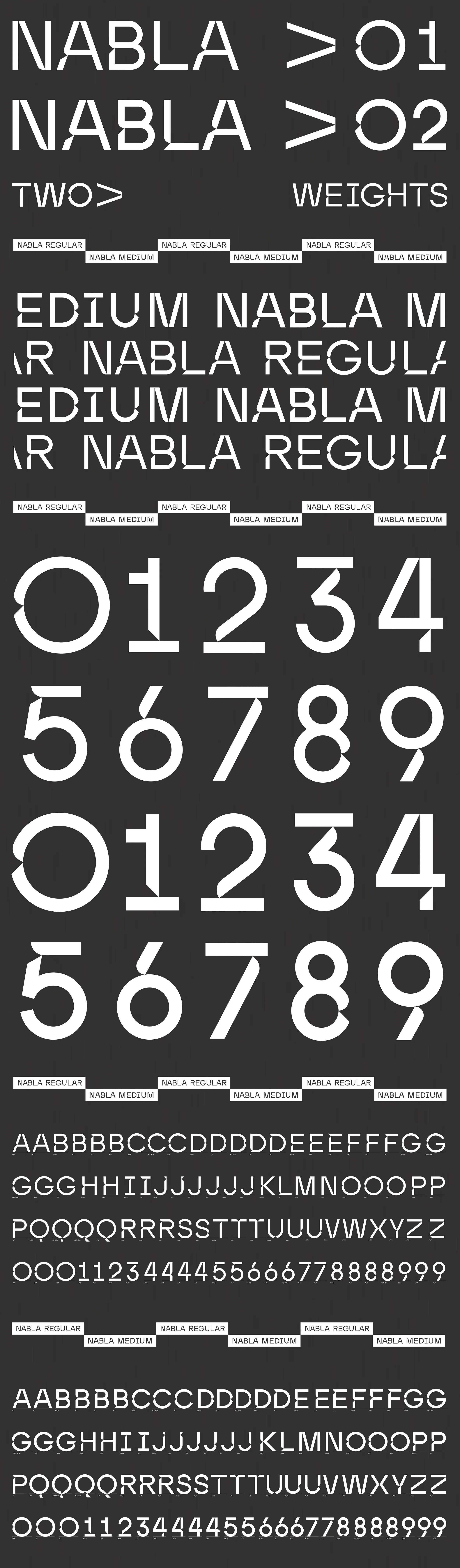 The font structure revolves around a notch which cuts into a single section of each character predominately where sections of a character link.
