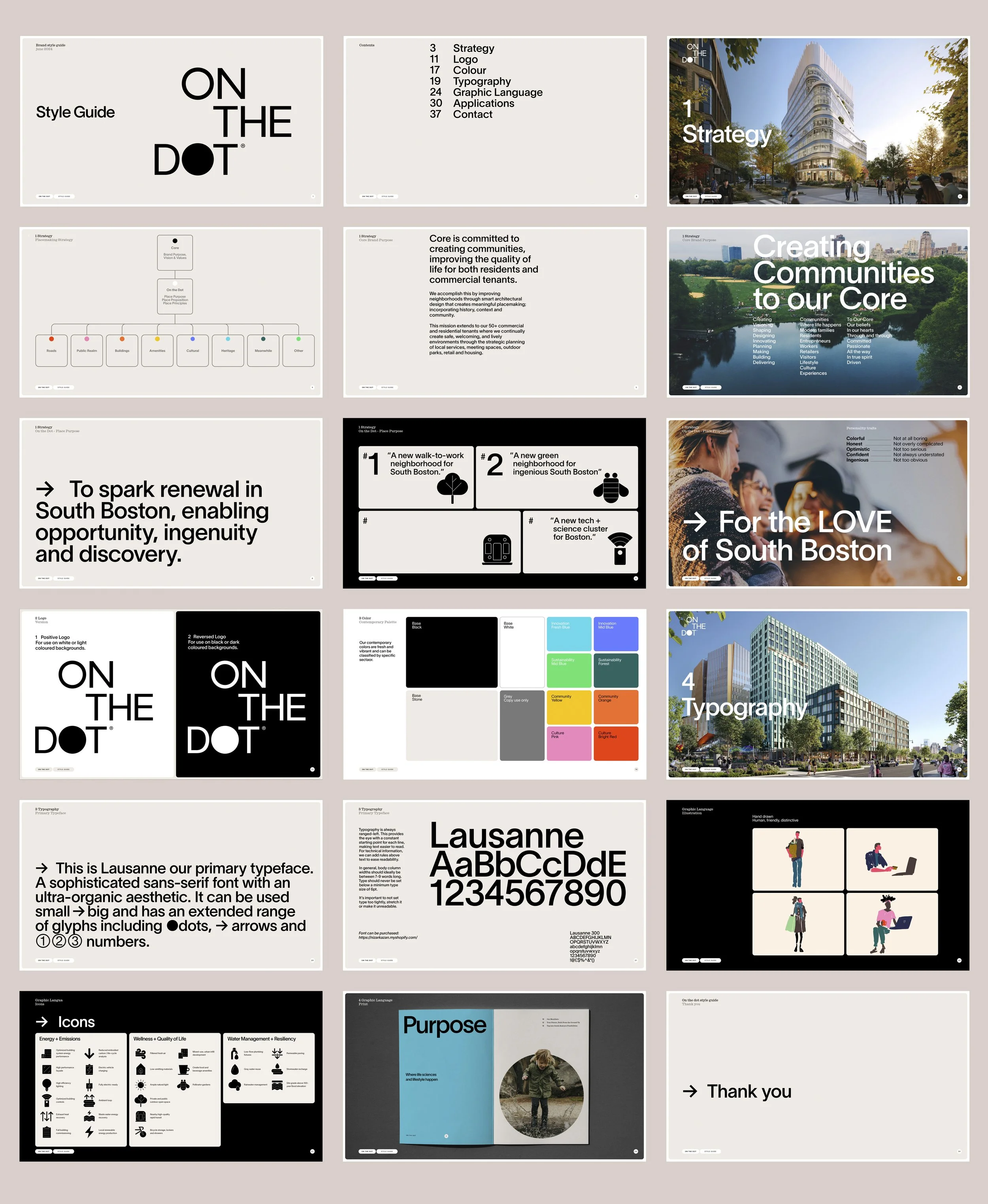 Designed in collaboration with Greenspace. ON THE DOT is a commercial and residential development in South Boston which is working hand in hand with the neighborhood and the City of Boston. Below is a presentation for the refresh of their style guide.
